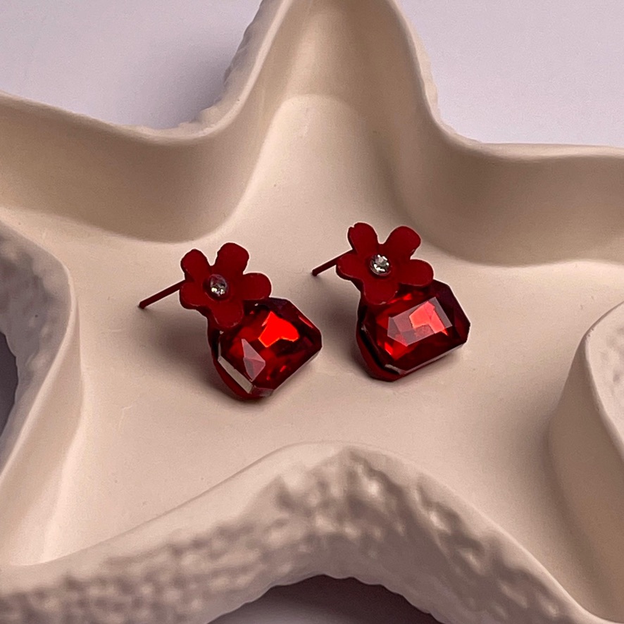 Add a touch of vibrant elegance to your look with these stunning Ruby Glow Petal Studs. Featuring dazzling deep red gemstones that catch the light beautifully, each stud is topped with a delicate flower accent adorned with a sparkling crystal center. Perfect for both everyday wear and special occasions, these earrings bring a radiant glow and floral charm to any outfit.
