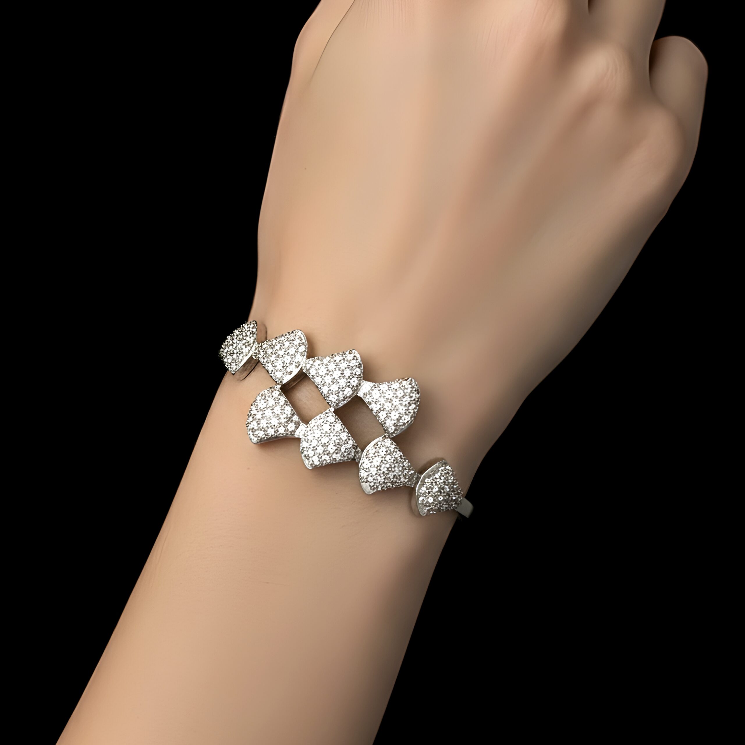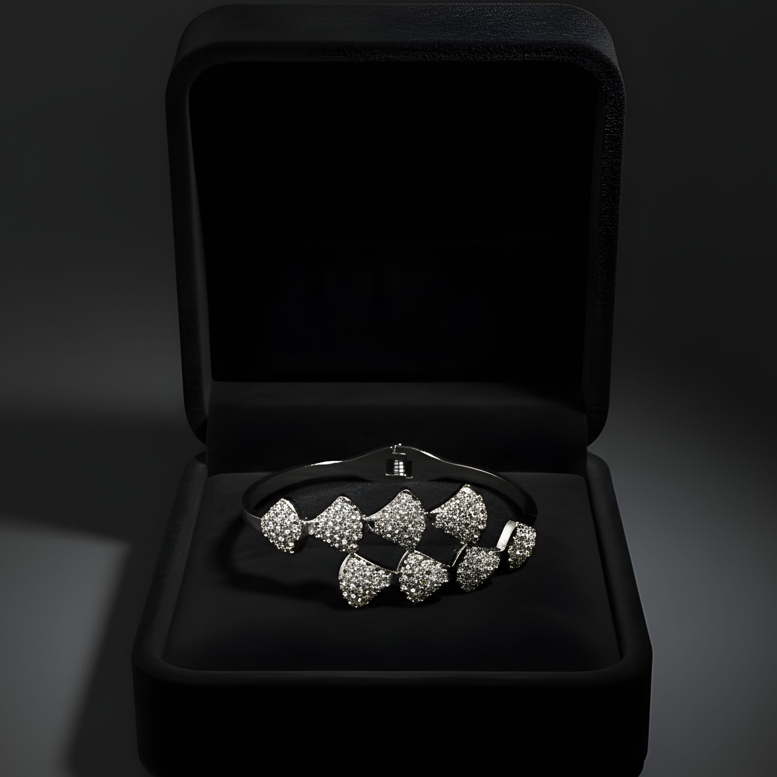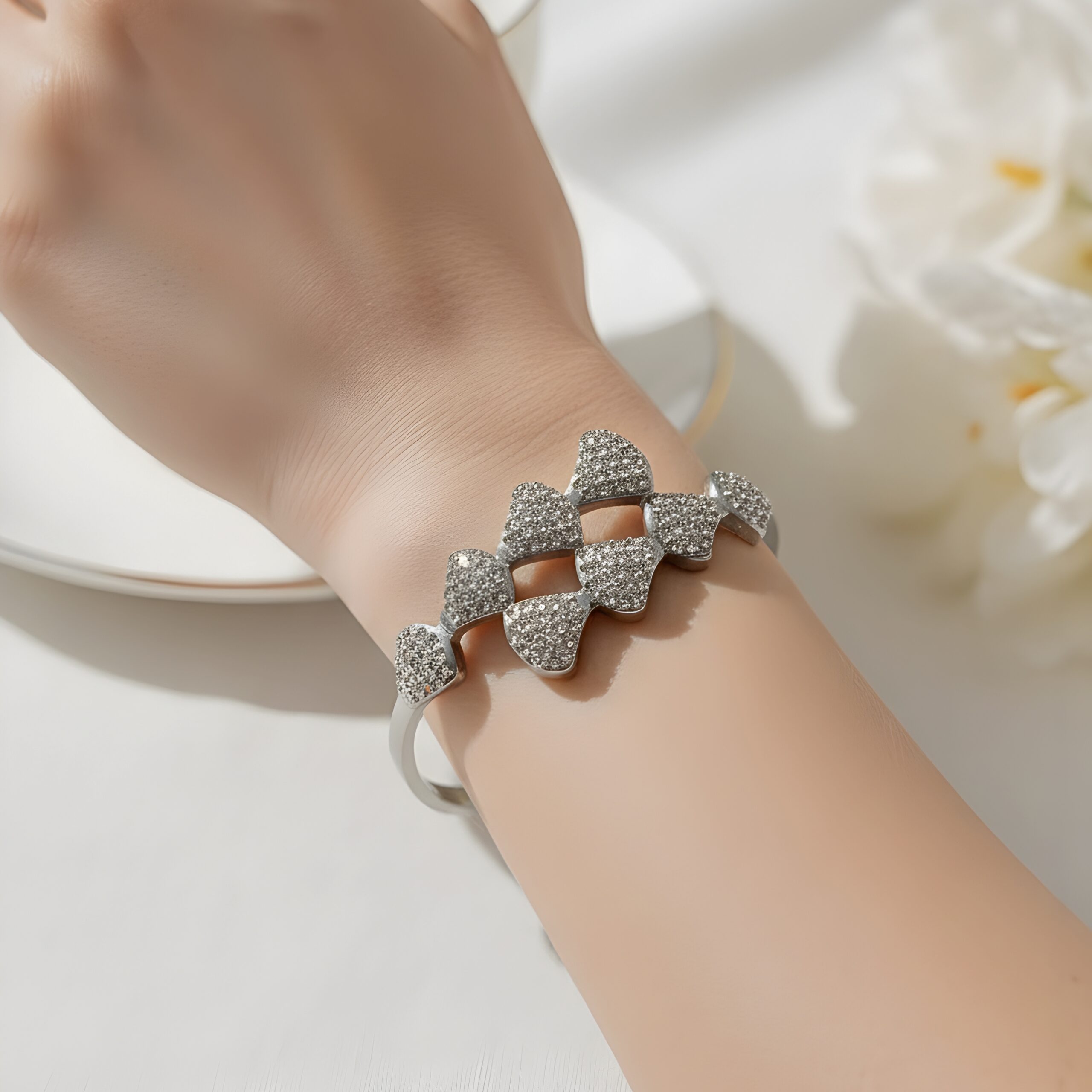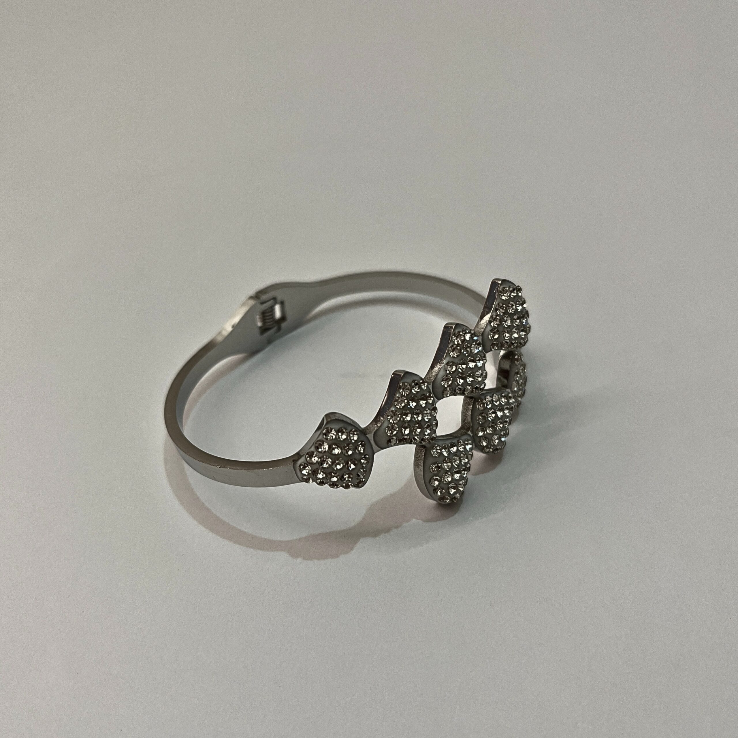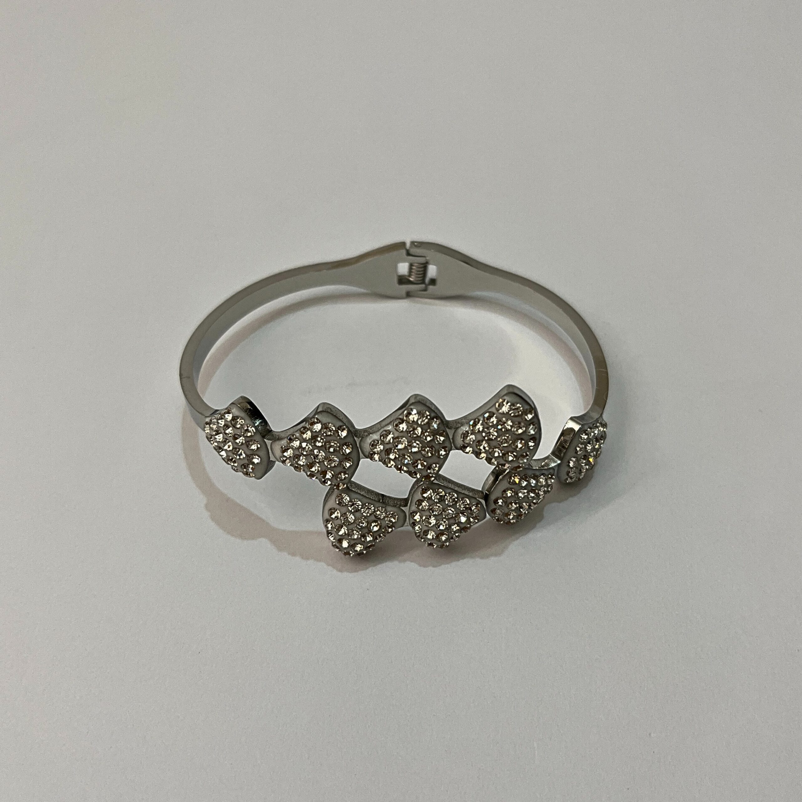 - Material: Silver-toned bangle bracelet featuring multiple heart-shaped clusters of cubic zirconia.