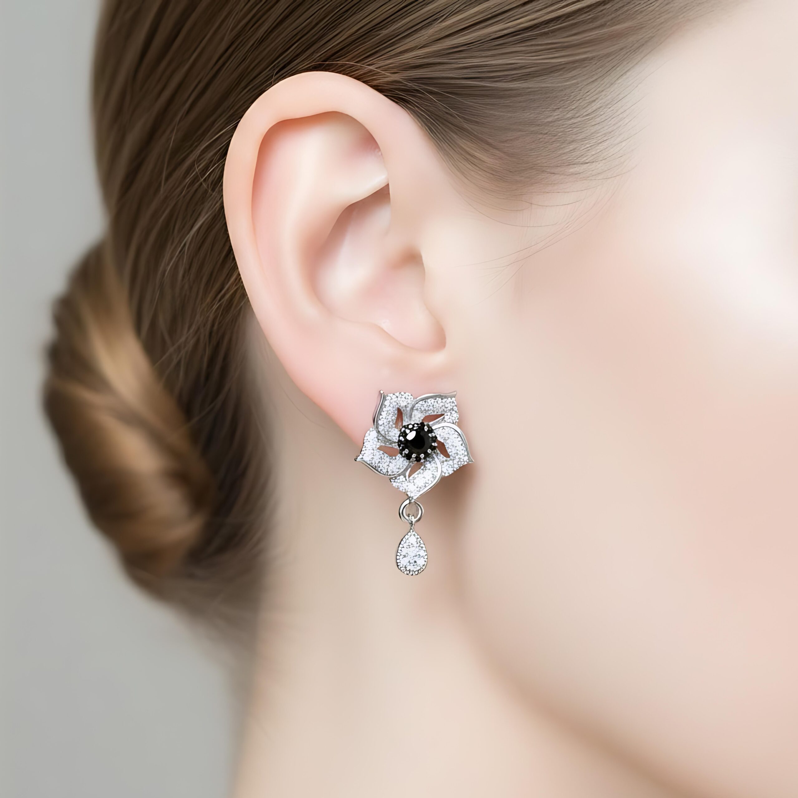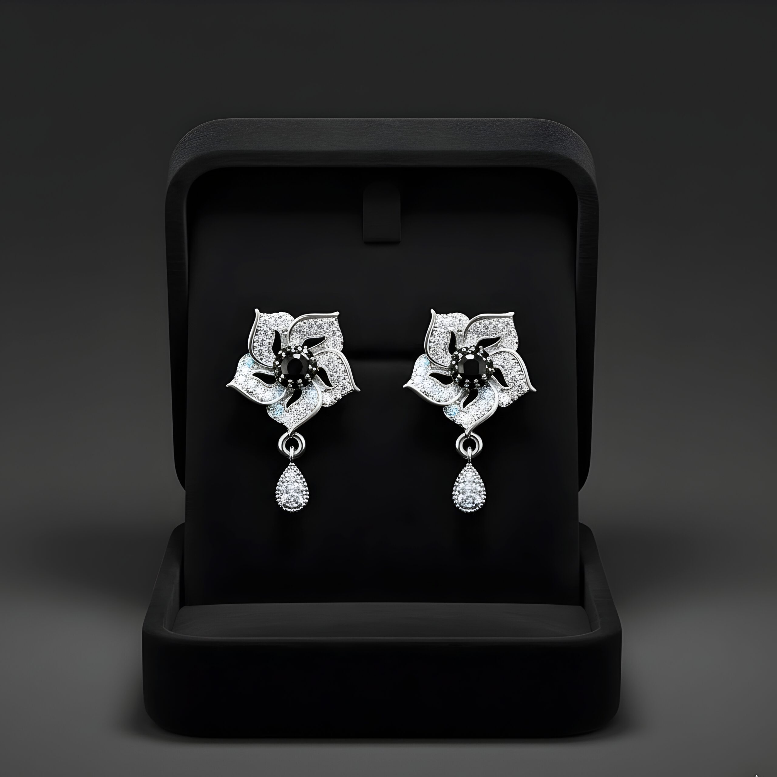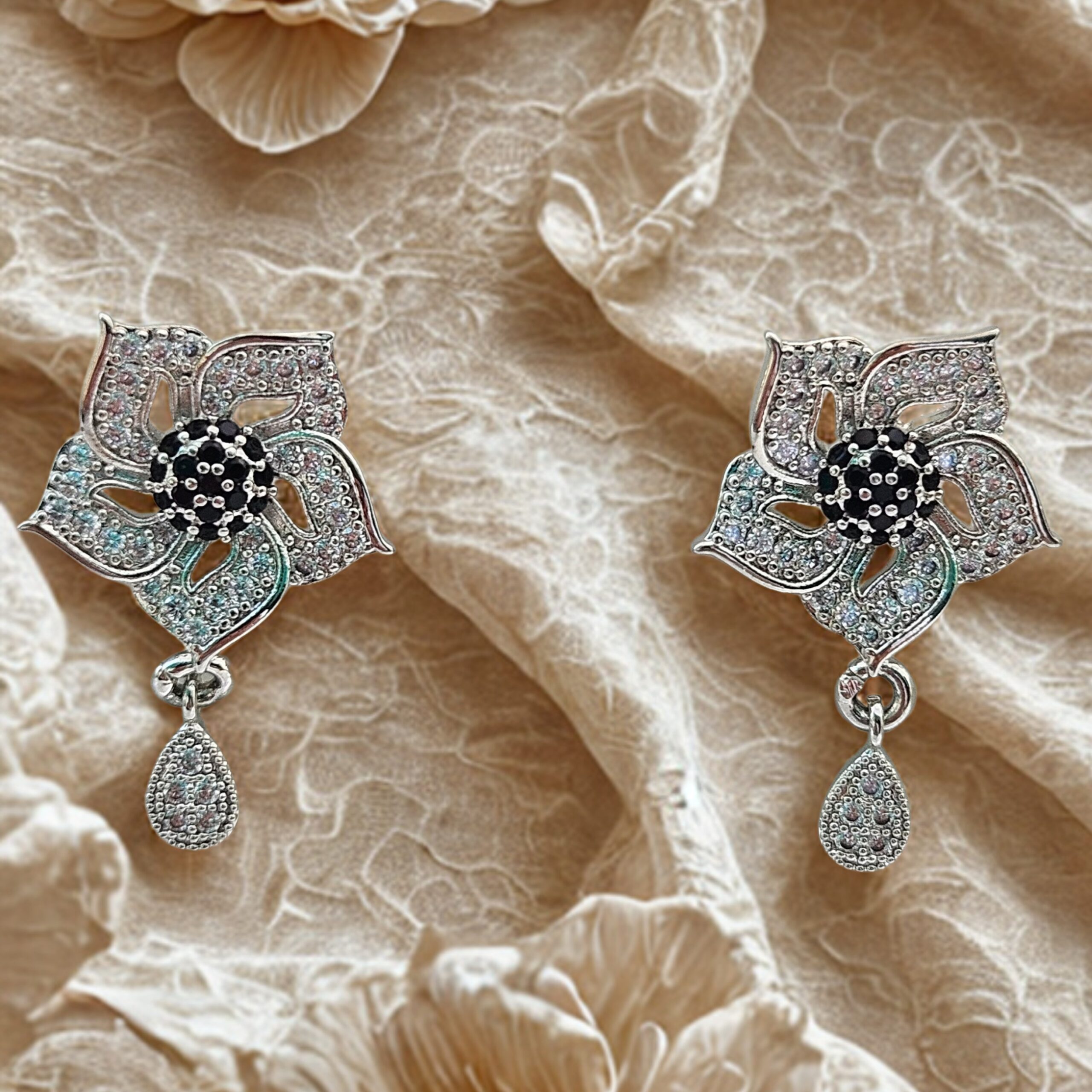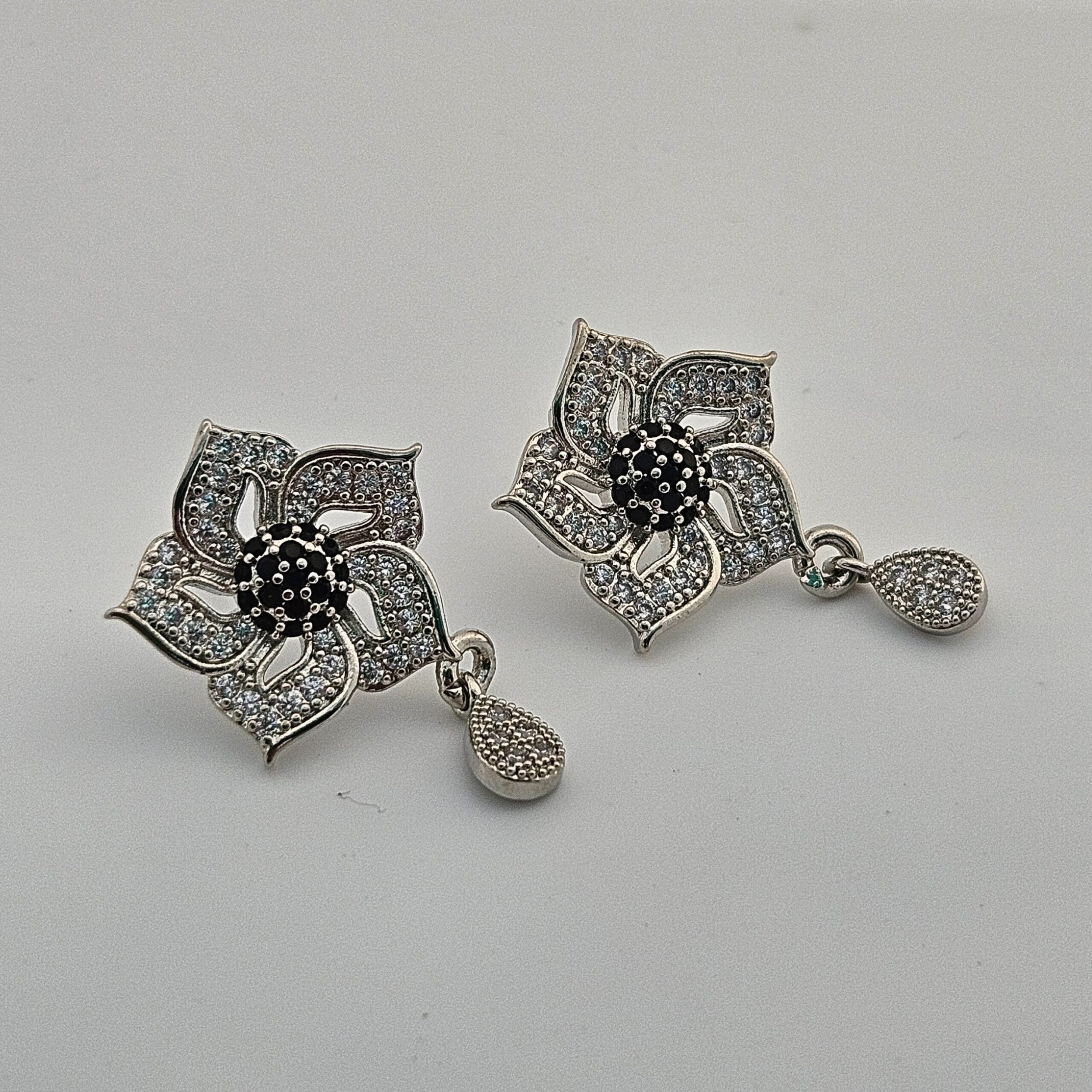 Stones: The earrings are meticulously set with multiple clear and black cubic zirconia stones.